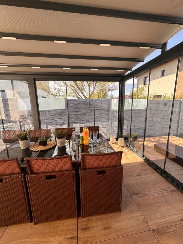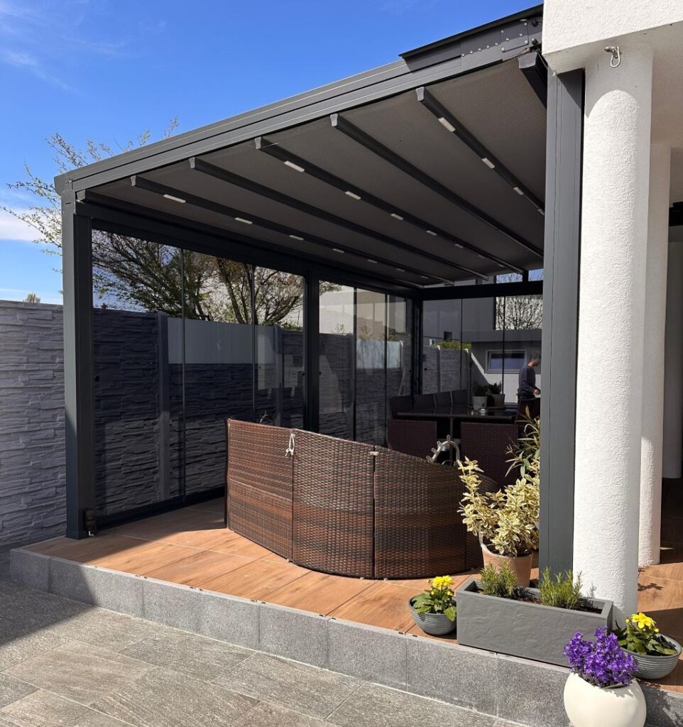 Dank der modularen Bauweise lässt sich die Glasschiebewand ideal mit Ihrer Terrassenüberdachung kombinieren und steigert den Wohnkomfort erheblich.