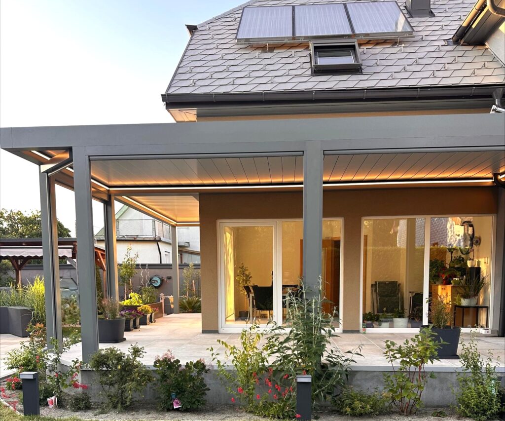 Smarte Features: Ein unsichtbares Regenablaufsystem leitet Wasser effizient ab, damit Ihre Terrasse immer trocken bleibt. Optional sorgt eine integrierte LED-Beleuchtung für eine stimmungsvolle Atmosphäre in den Abendstunden.